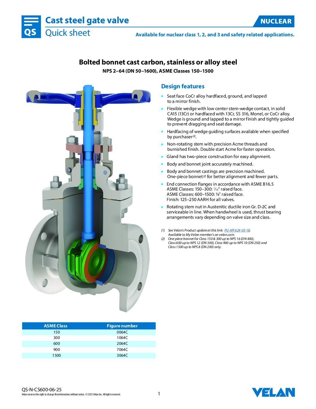Finish: 125–250 AARH for all valves. - Rotating stem nut in Austenitic ductile iron Gr. D-2C and serviceable in line. When handwheel is used, thrust bearing arrangements vary depending on valve size and class.